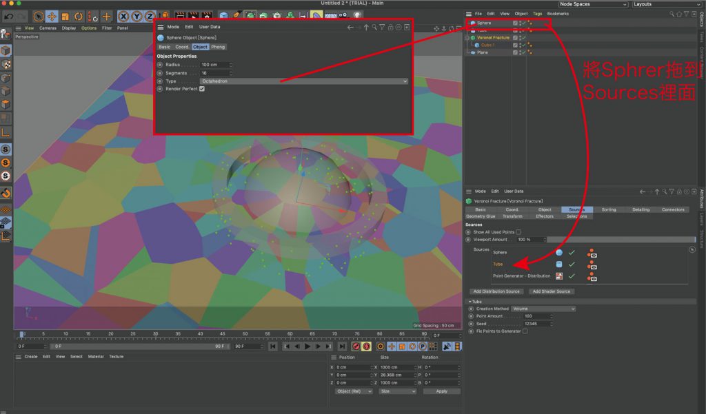接著我們製作一個Tube 並將Tube拖拉到Voronoi Firacture的Sources裡面,並將Creation Method的模式改為Volume,Point Amout的數值也調高到100。