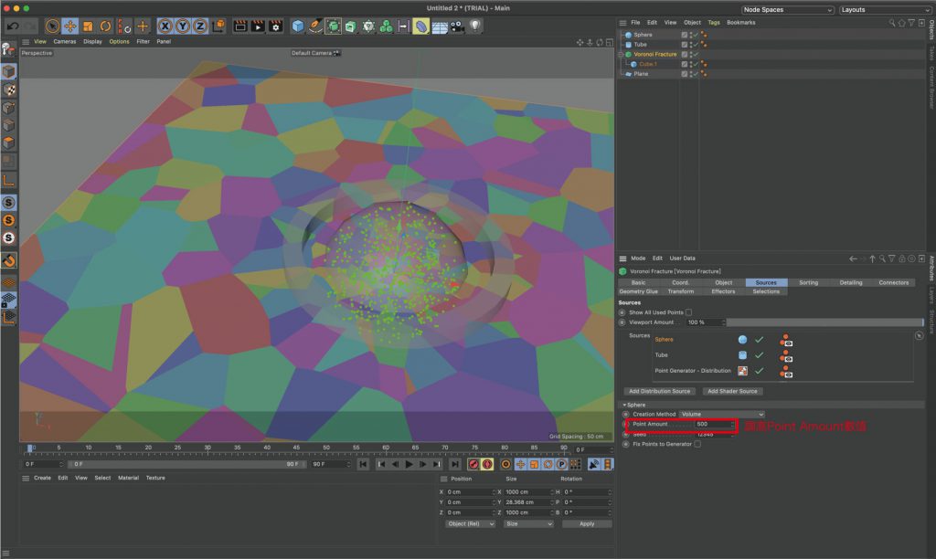 Sphere我們也是要調高Point Amout的數值,只要點選Voronoi Firacture的Sources裡面的Sphere就可以調整了。