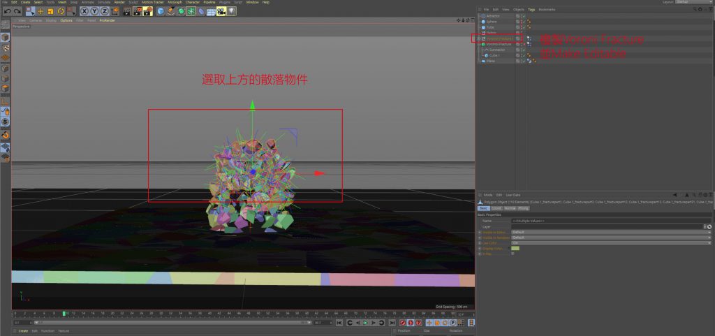 這邊我們複製原本的Voroni Fracture 並Make Editable讓他變成物件,接著用選取工具選擇上方的散落物件。