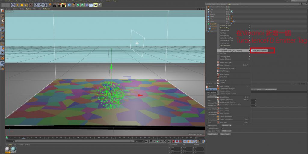 這時候就可以看到我們煙霧動畫的範圍已經跟爆裂場景吻合了,接著我們在Voronoi 新增一個 TurbulenceFD Emitter Tag。