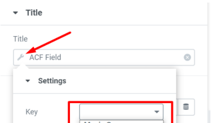 在Elementor編輯中, 每個元素模組中,點選右上icon,就是可以設定動態元素的地方並選擇ACF>ACF Field。