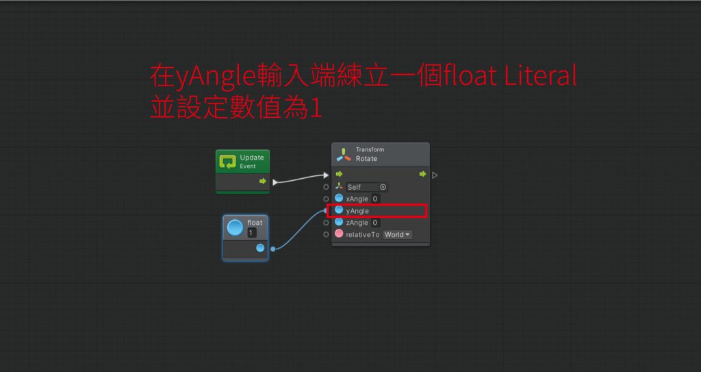 接著我們要在yAngle輸入端建立一個Flaot Literal並設定數值為1,如果常寫C#語法的朋友應該對於Float並不陌生,通常使用在宣告一個型別為float 變數,而這邊就是宣告yAngle會改變1在每一個frame上面。
