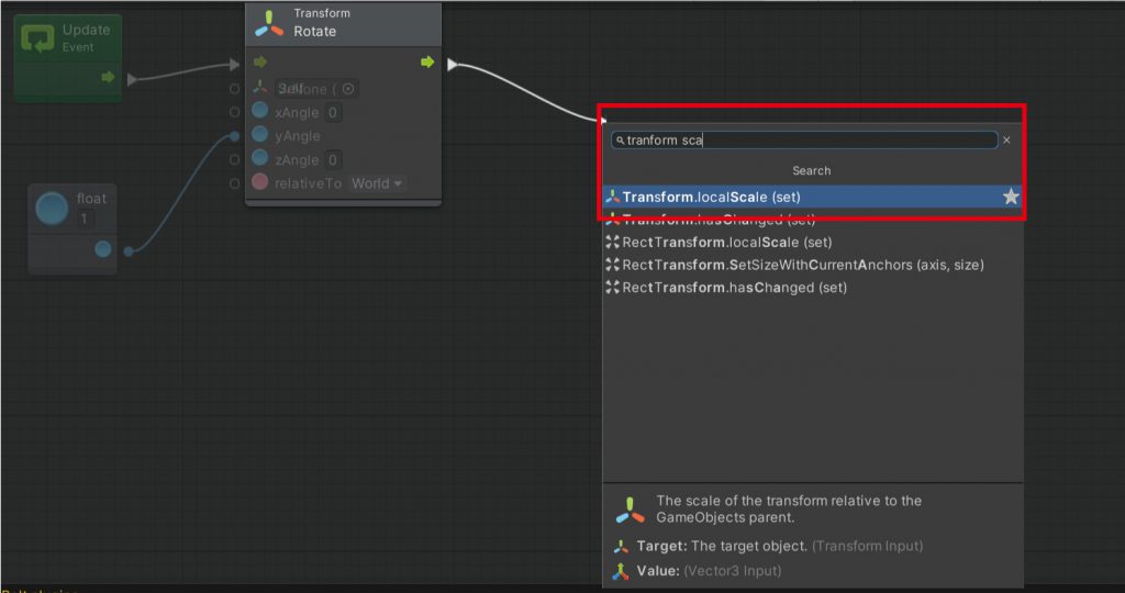 因為bolt可以做的事情就是node串連,當然不是只有一個功能就能練習得到什麼,所以我們接著試試看改變大小,這邊我們在剛剛的Rotate輸出端新增一個Transform localScale(Set)的Node。