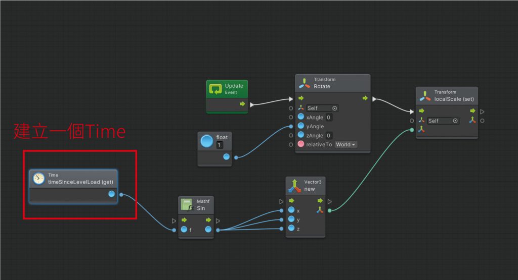 這邊我們建立一個vector3 的Node讓X、Y、Z三軸可被控制,因為變化大小練習可以用Mathf的Sin曲線,這樣我們就不用另外設定每個大小的數值了。