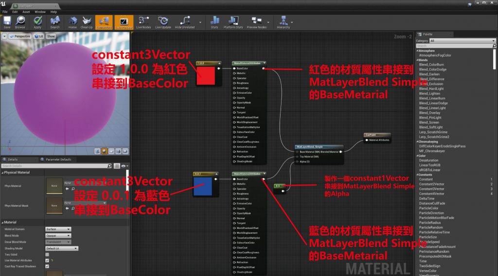 首先我們來試試看unreal的BlendSimple這個node看看,建立一個constant3Vector 設定 1.0.0 為紅色 串接到BaseColor,建立另外一個constant3Vector 設定 0.0.1 為藍色 串接到另一個Attributes的BaseColor,接著將紅色的材質屬性串接到 MatLayerBlend Simple 的BaseMetarial,而藍色的材質屬性串接到 MatLayerBlend Simple 的BaseMetarial,之後我們製作一個constant1Vector 串接到MatLayerBlend Simple 的Alpha,最後將Blend Simple輸出給我們的Mat看看。