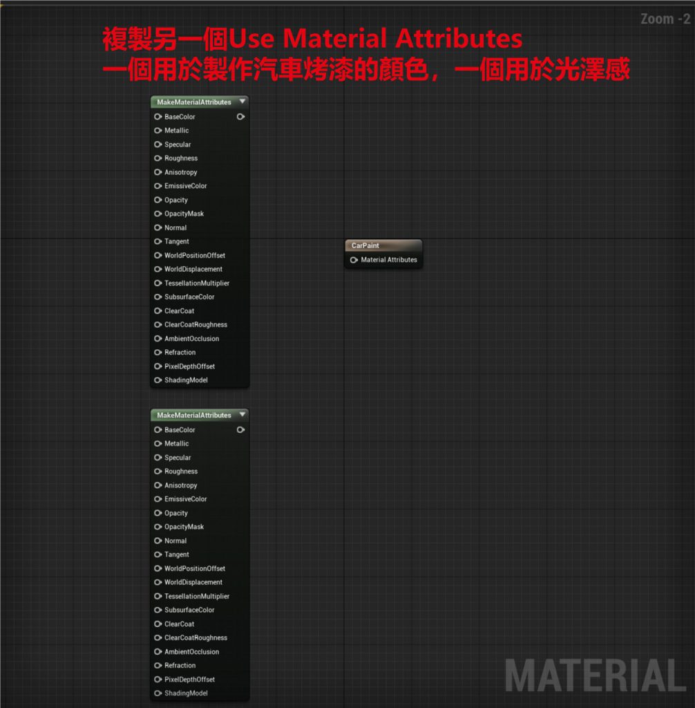 因為是汽車烤漆的材質,所以我們需要兩個 Make Material Attributes 的Node,一個node主要是用於製作汽車烤漆另一個則是製作光澤感。