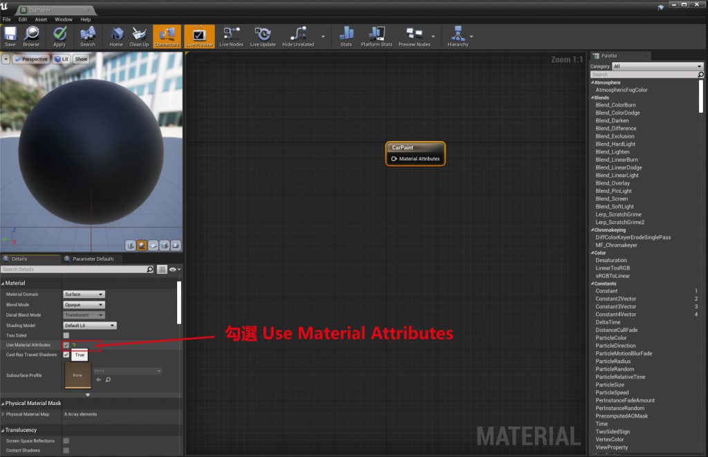 比較特別的是因為我們這次的材質需要一些Blend混合來製作材質,所以我們先將我們的Master Node點選並勾選Use Material Attributes 製作材質屬性 ,讓這個輸出Node變成只有一個 Material Attributes 的輸出通道。