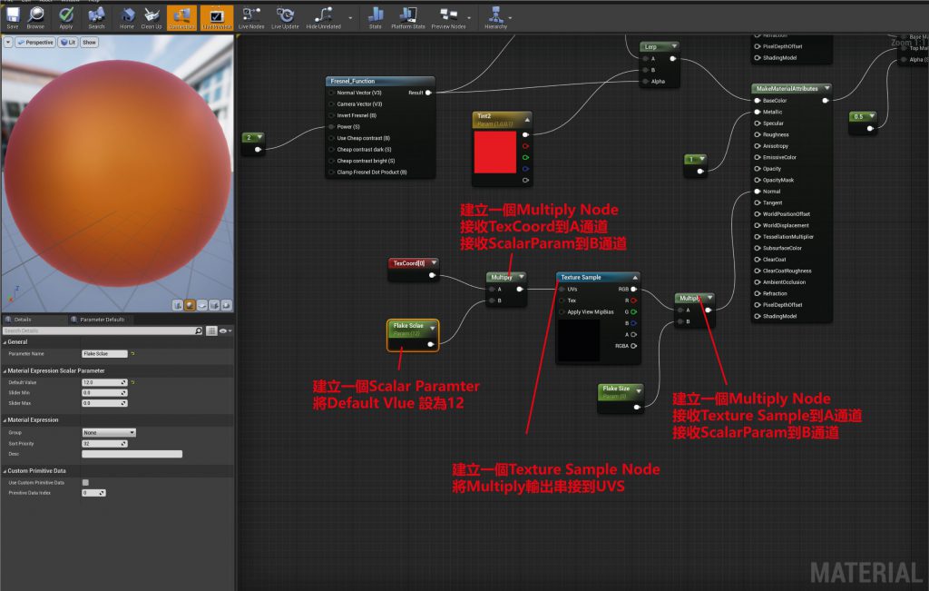 首先建立一個Scalar Paramter 將Default Vlue 設為12,建立一個Multiply Node 接收TexCoord到A通道 接收ScalarParam到B通道。