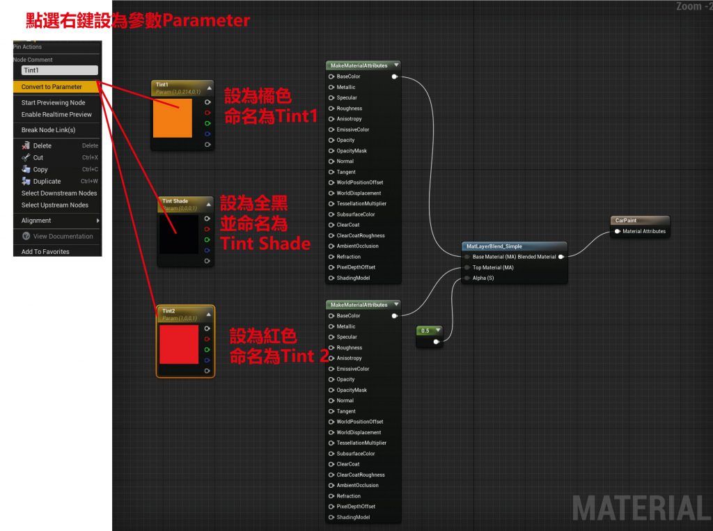 這邊我們重新整理一下我們的Node,將原本的兩個Vector3 Node按住Alt+左間斷開連結,並複製一個Vector 3設定為全黑色,分別將我們三個Vector3 Node 設為參數並重新命名為Tint1、Tint Shade、Tint2,設為參數以後我們在調整材質球就可以直接在材質球上調整而不用在進入到UE的材質編輯器裡面。