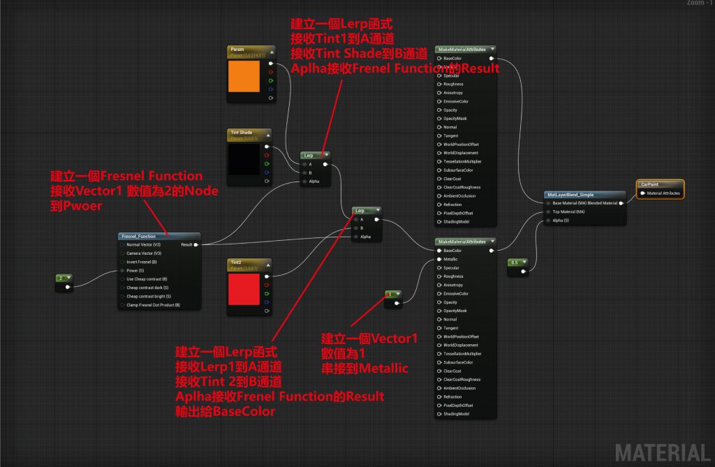 建立另一個Lerp函式 接收Lerp1到A通道 接收Tint 2到B通道 Aplha接收Frenel Function的Result 輸出給下方的 Make Material Attributes Node 的 BaseColor。