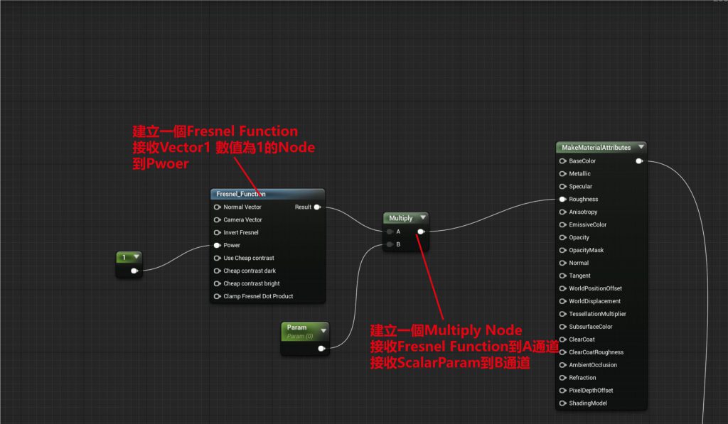首先建立一個Fresnel Function 接收Vector1 數值為1的Node 到Pwoer,接著建立一個Multiply Node 接收Fresnel Function到A通道 接收ScalarParam到B通道。