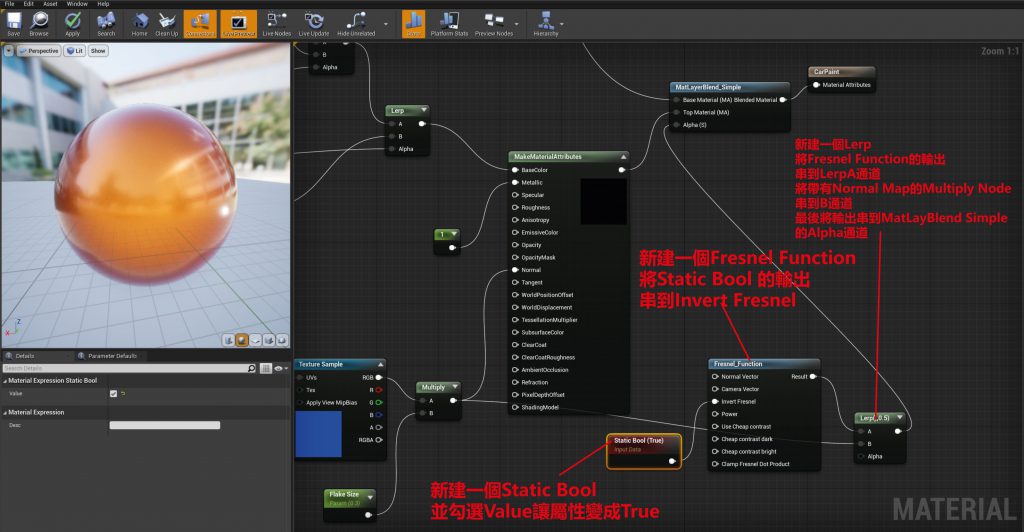 首先新建一個Static Bool 並勾選Value讓屬性變成True,接著新建一個Fresnel Function 將Static Bool 的輸出 串到Invert Fresnel,接著新建一個Lerp 將Fresnel Function的輸出 串到LerpA通道 將帶有Normal Map的Multiply Node 串到B通道 最後將輸出串到MatLayBlend Simple 的Alpha通道。