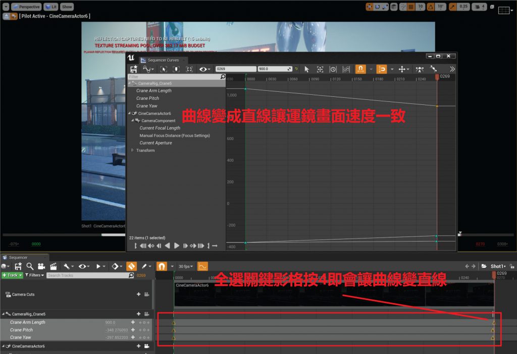 預設的影格會呈現曲線的模式,這時候我們只要將關鍵影格全選並按數字4,UE就會自動幫我們將動畫的曲線變成直線,讓運鏡看起來更順暢。