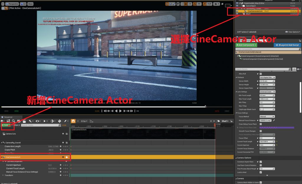 接著我們一樣新增CineCamera Actor的影格,先選擇 CineCamera Actor 並在 Sequencer 點選Track並找到 CineCamera Actor 即可將我們的攝影機做出影格。