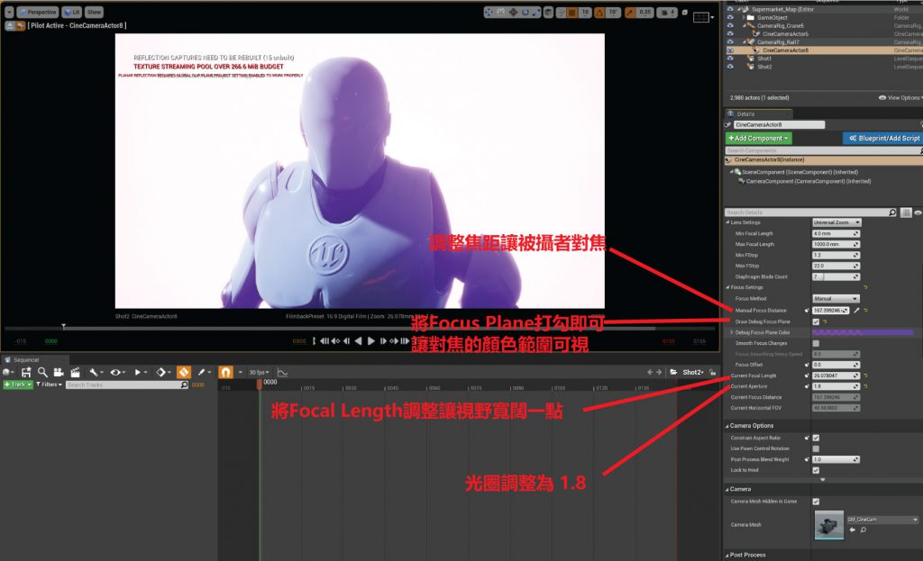 接著對焦的動作,我們調製Focus Distance,如果只是單純調整 Focus Distance 的話可能不夠精準,我們將Draw debug Focus Plane打勾就可以看到預設的紫色,這樣我們在做對焦的時候就可以依照顏色範圍得知自己對焦的範圍到哪。