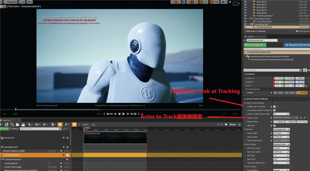 我們這時候就選擇攝影機並勾選Enble Look at Tracking即可開啟追蹤的功能,我們接著從Actor to Track選擇目前被拍攝的物件,一開始追蹤的時候會完全跑掉,但我們只要調整攝影機的Offset即可回到角色的臉部視角。
