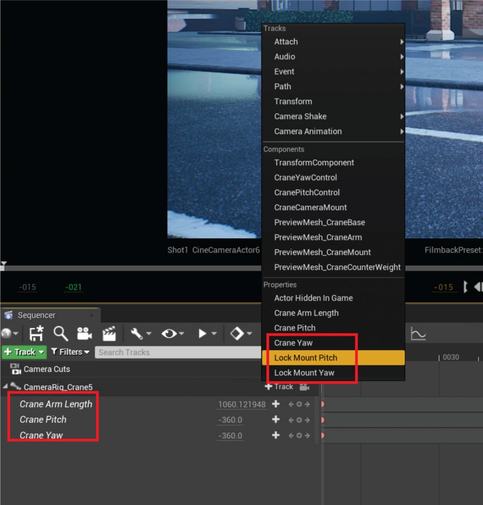 接著我們在Sequencer做CameraRig Crane的影格,首先我們要選擇 CameraRig Crane 並在 Sequencer 點選Track並找到 CameraRig Crane 即可將我們的吊臂做出影格。