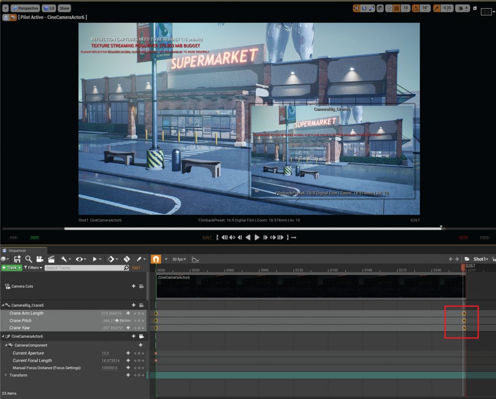 猶如我們製作關鍵影格動畫的經驗,在UE裡面也是一樣我們拉到最後一格以後對吊臂的數值做調整就會產生關鍵影格了。