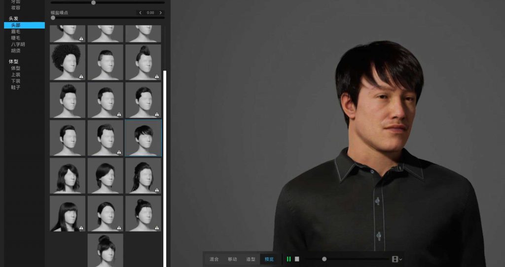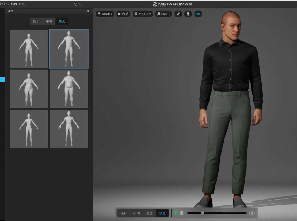啟動完成,這就是主畫面。讓人想起Adobe系列的捏人工具,但就逼真度來說,Adobe就品質來看,還看不到MetaHuman的車尾燈。